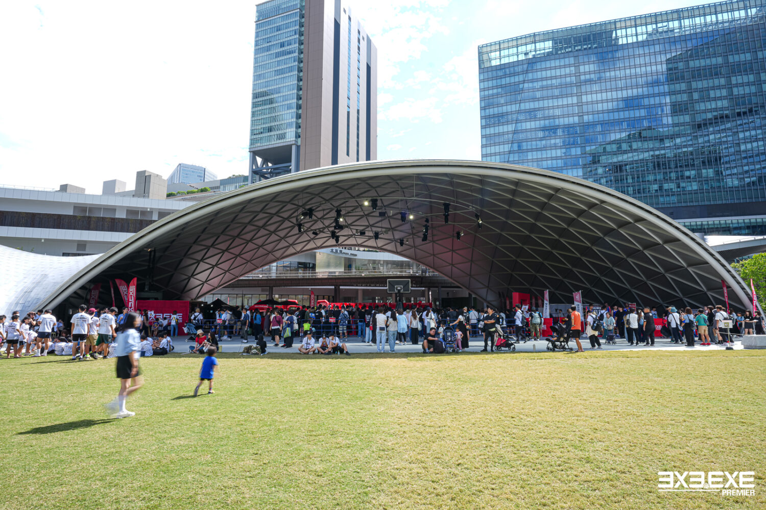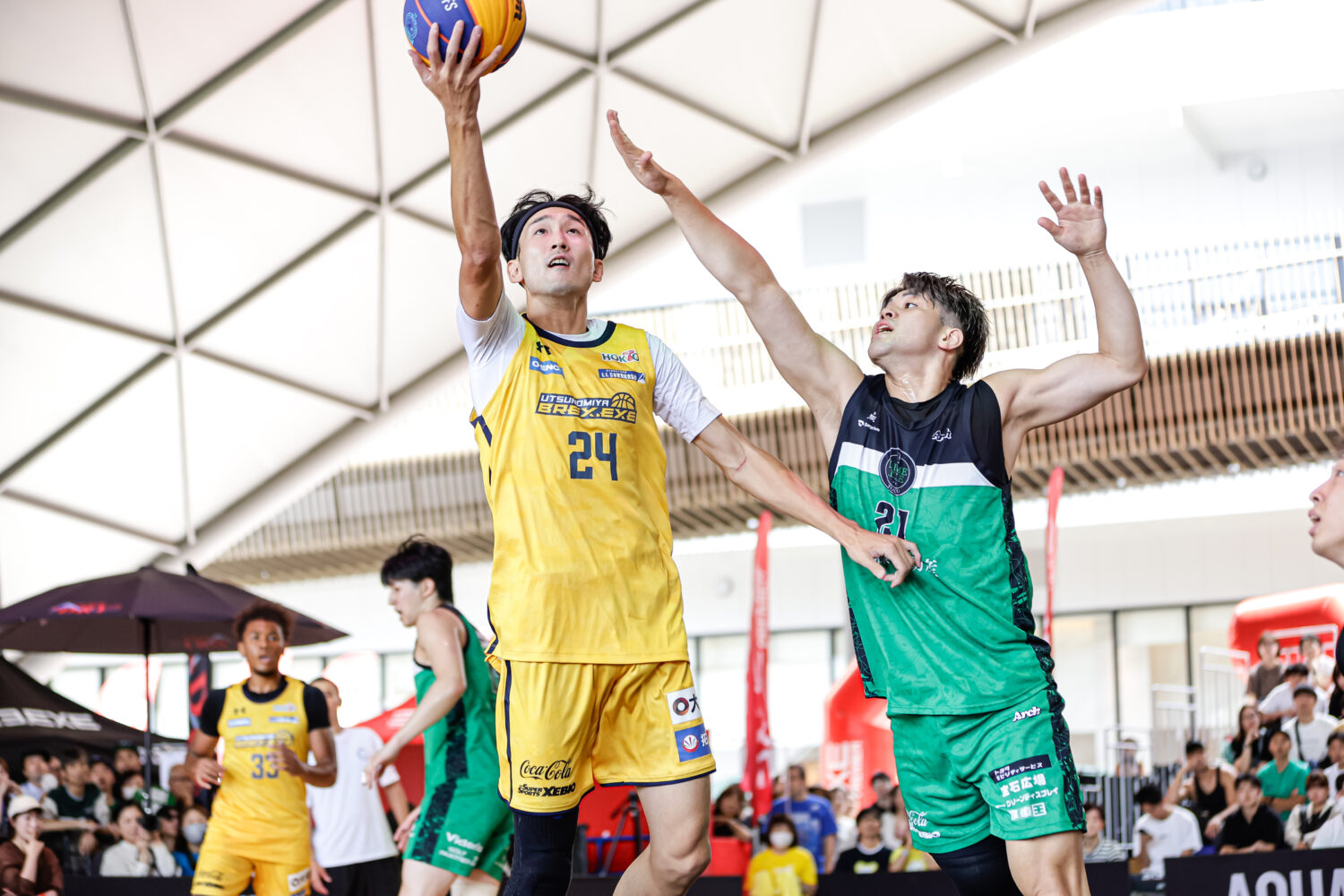そんな芝生広場のすぐ隣にあるロートハートスクエアうめきたが、今回の舞台である。シンボリックな円形の屋根が特徴的な大屋根イベントスペースの下に、特設コートが出現。3×3のファンはもとより、偶然ここを通りかかった人々から「バスケやってるやん」「デカイ!」「バスケでDJあるんだね」といった驚きの声が上がるなど、注目を集めていた。
