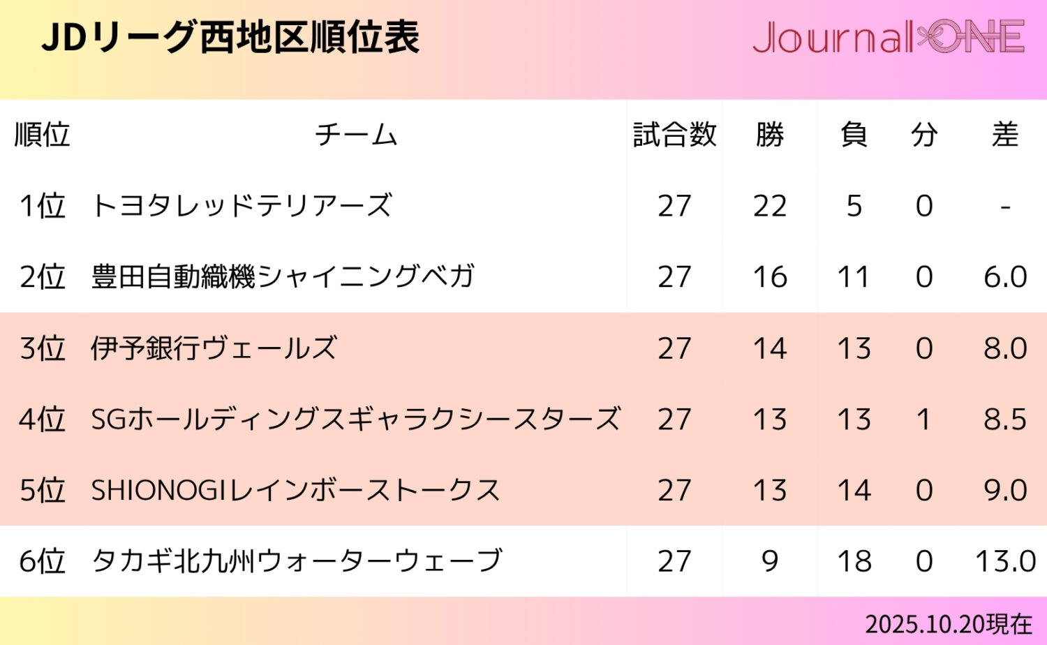 JDリーグ(女子ソフトボール)の2025年シーズンも、いよいよ最終節を迎える。西地区ではトヨタレッドテリアーズが圧倒的な強さで優勝を決めているが、注目すべきはその下位争い。2位の豊田自動織機シャイニングベガに続く「3位」の座を巡り、伊予銀行ヴェールズ(3位)、SGホールディングスギャラクシースターズ(4位)、SHIONOGIレインボーストークス(5位)の3チームが、わずかの差で激しく競り合っている。