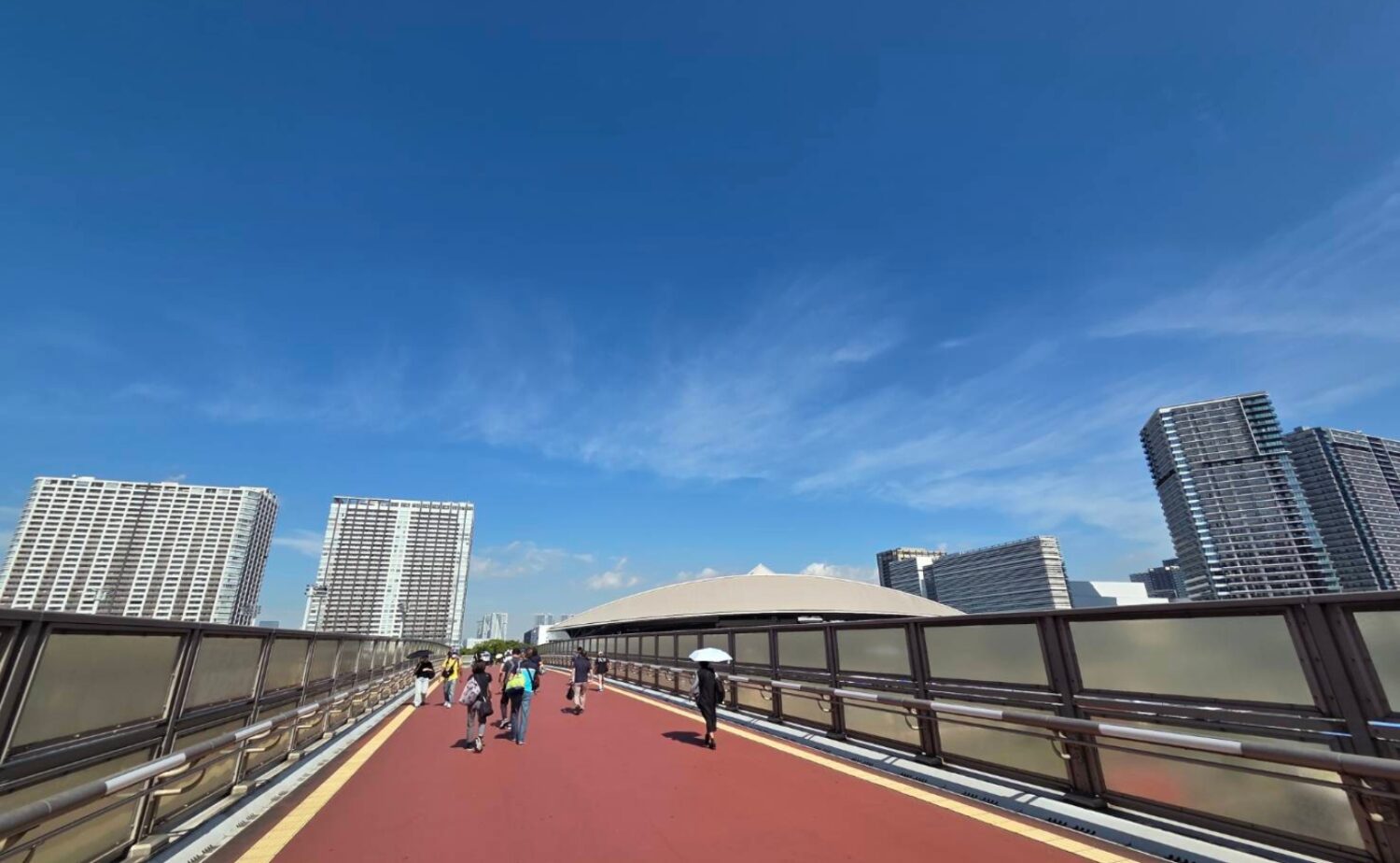 国際展示場駅の改札の抜け、天井の高い駅舎を出ると、初秋の青空が広がっていて、着ていた半袖Tシャツと八分丈のパンツで丁度気持ち良い陽気。もちろん、アルカラスの出る夕方から夜にかけての試合に備え、バッグには綿のカーディガンを持参している。駅を出て右へ曲がり、数十m先でさらに右へ曲がると、高速道路に架けられた歩行者専用の橋があり、これを渡った先に目指す有明テニスの森公園が広がっている。