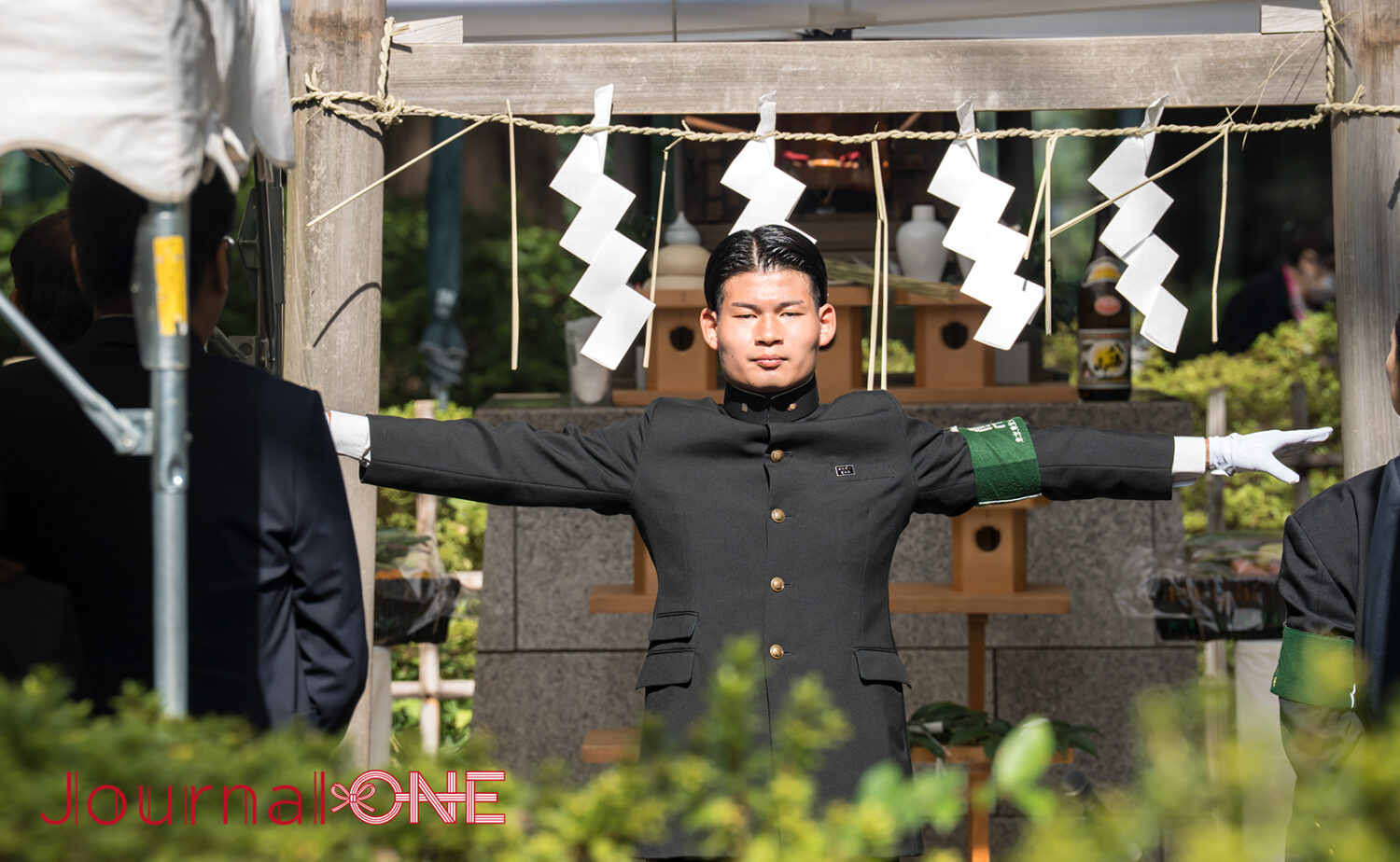 東京農業大学世田谷キャンパスには都心とは思えない静寂に包まれた小さな杜の中央に、鎮座し行われる豊受大神宮への奉献式。神職の祝詞、創立134年 収穫祭2025の安全な開催を祈る関係者たちの玉串拝礼と続くと最後に、全学応援団の団長が学歌を奏上した。