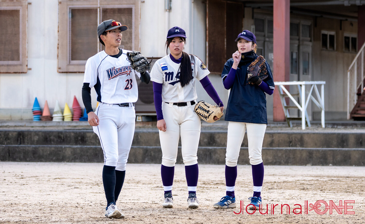 明治大学 女子硬式野球クラブの柴田選手(右)と上村選手(左)も練習に参加-Journal-ONE撮影