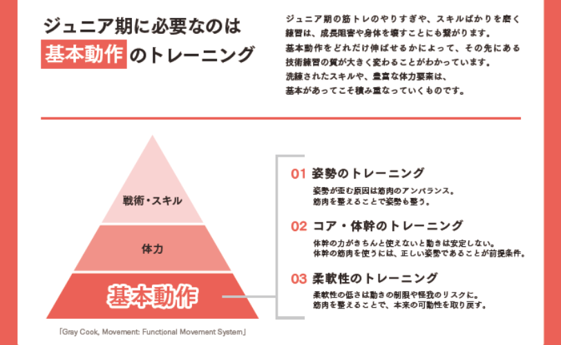 下から『基本動作(姿勢・可動性・安定性)』 → 『体力要素(筋力・スピード・パワー)』 → 『技術・戦術』という順番で積み上げるのが、最も効率よく安全に伸びる方法であることを示しています。つまり、体が正しく動かない状態で技術練習だけしても効果が薄い。柔軟性や安定性が低いと、パワーもスピードも伸びない。すなわち機能が整うと、技術習得がスムーズになるという考え方です。