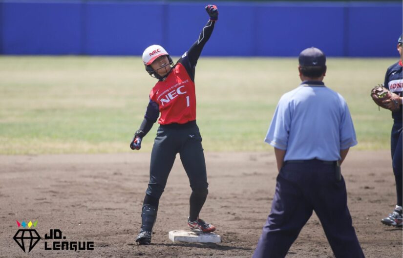 1点を追いかけるNECプラットフォームズはすぐさま反撃。2回裏、2死から8番・原 日菜海が死球で出塁すると、西山 麗監督の積極的な作戦で盗塁を仕掛けた。見事セーフとなり2死二塁と得点圏に走者を置くと、打席には今季初スタメンの塩田 優和。
