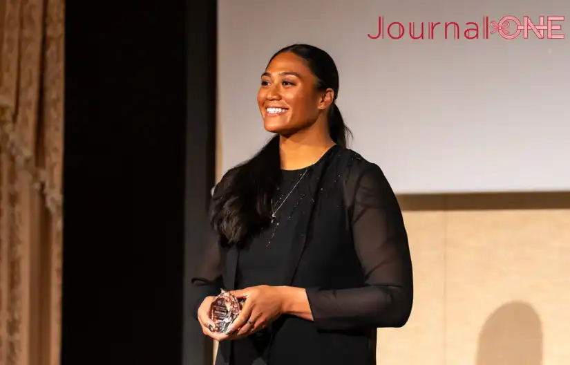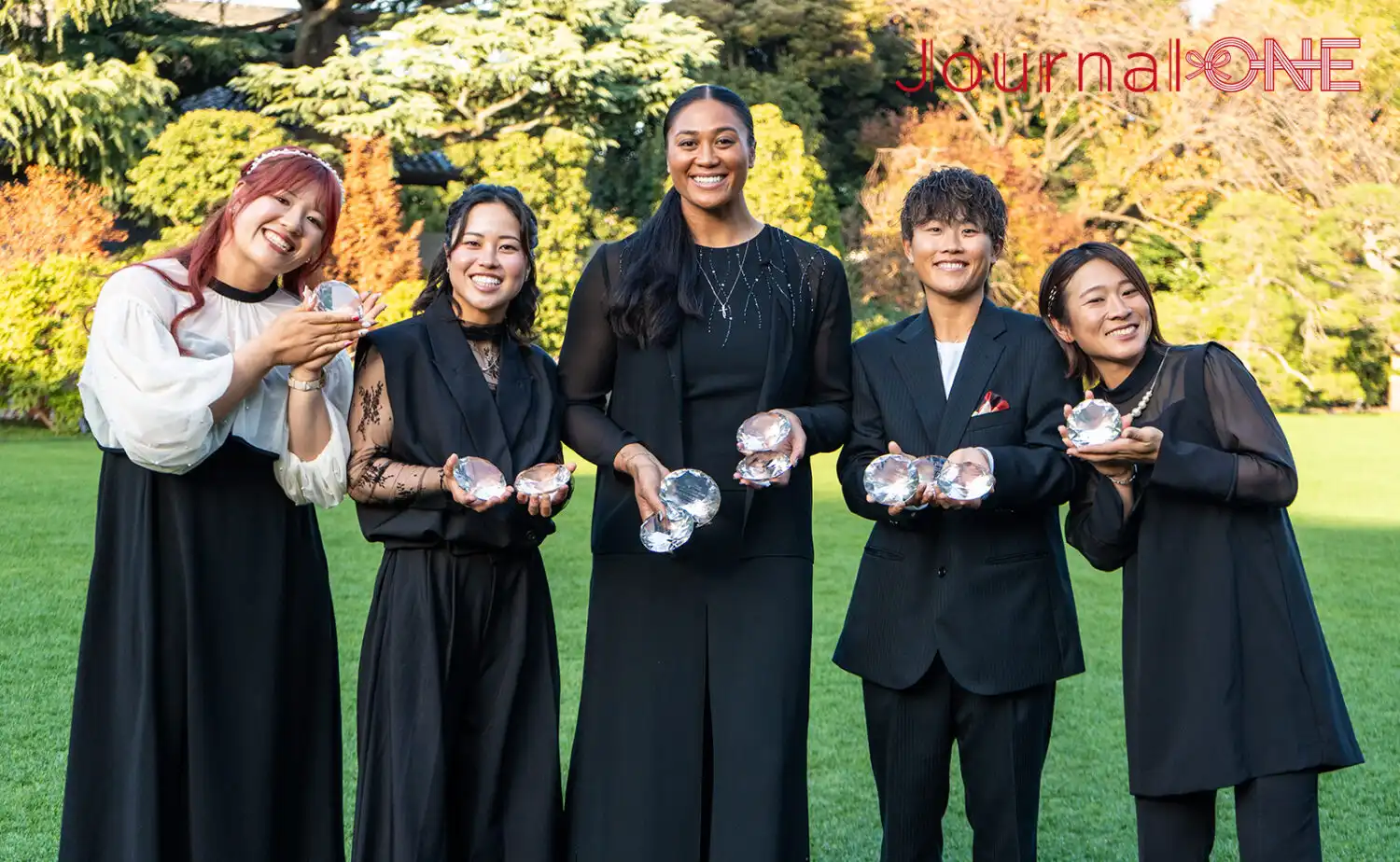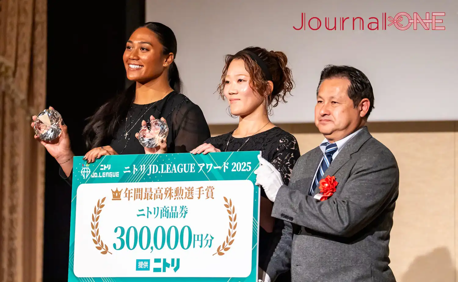Ayane Nakagawa (center), winner of the Most Valuable Player Award, and Managing Director Yamaguchi of Nitori Public Co., Ltd. (right) – Photo by Journal-ONE